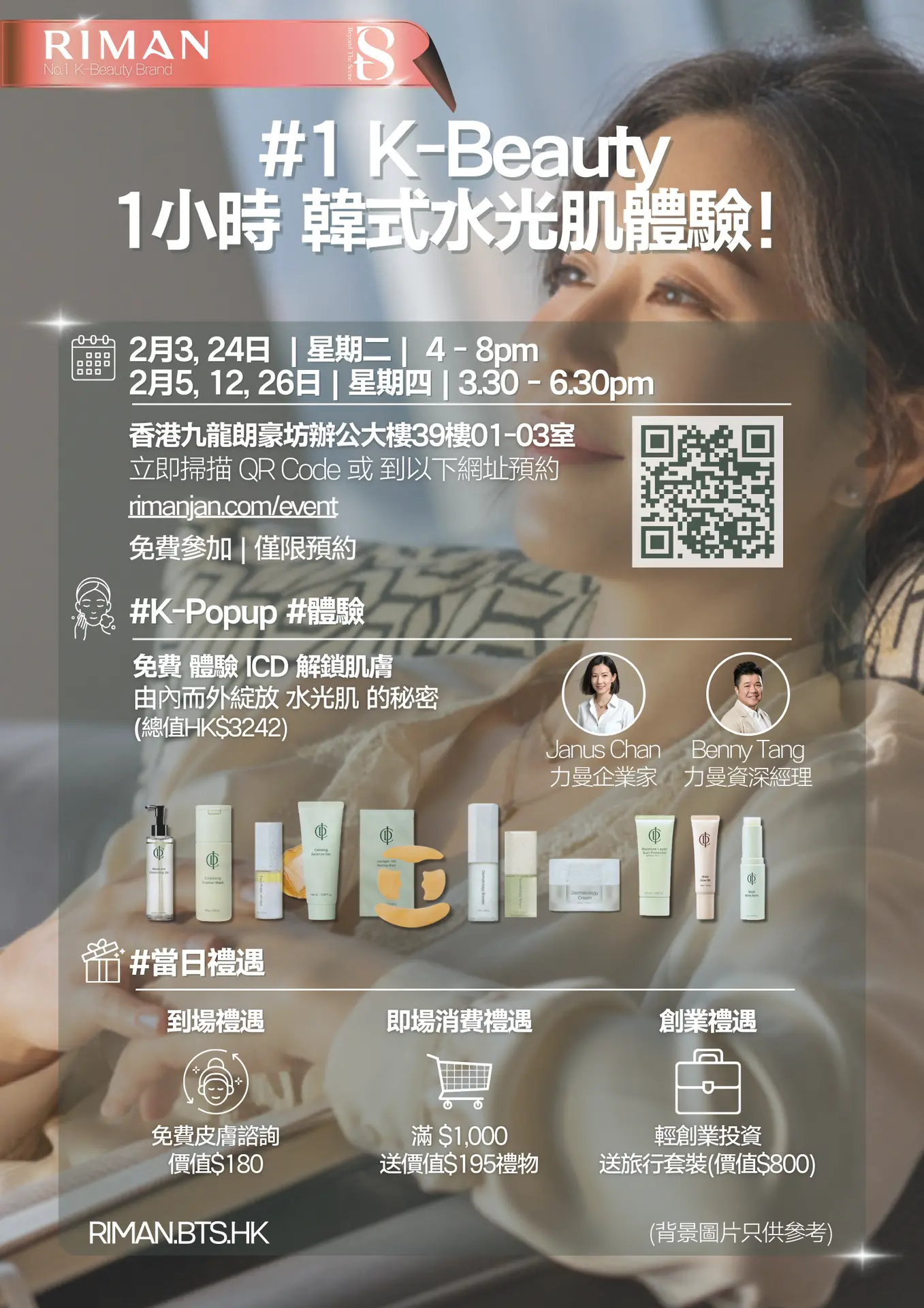 RIMAN誠意邀請你參加KBeauty產品體驗活動,由專業顧問現場帶領,親身感受韓國頂級護膚品的質感與功效。無論你是護膚新手還是美肌達人,都能找到屬於你的美麗方案,讓肌膚煥發自信光采。