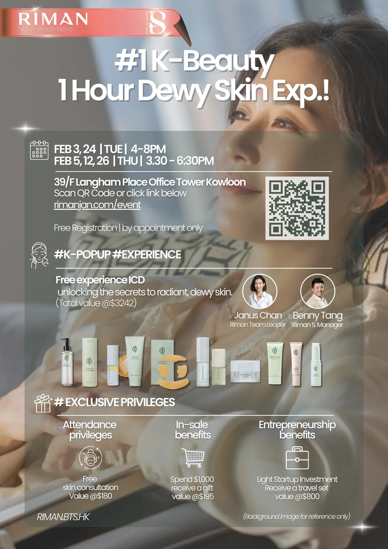 RIMAN誠意邀請你參加KBeauty產品體驗活動,由專業顧問現場帶領,親身感受韓國頂級護膚品的質感與功效。無論你是護膚新手還是美肌達人,都能找到屬於你的美麗方案,讓肌膚煥發自信光采。